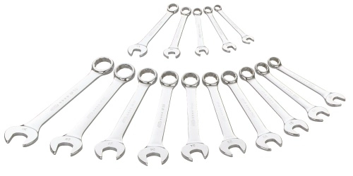 Alliance de 2 têtes de même ouverture, permettant avec la tête à fourche une approche rapide de serrage et un blocage surpuissant avec la tête polygonale dont le coudage à 15° assure une manoeuvre aisée en surface plane.