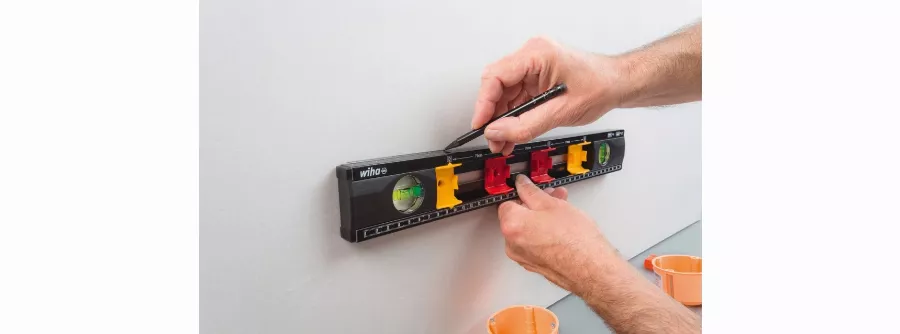 - L’électricien a souvent des difficultés à bien voir la fiole sur le niveau à bulles, notamment lors de l’installation de prises de courant au sol. Par ailleurs, lors du marquage, de laides entailles apparaissent fréquemment en raison des encoches au niveau de la fiole. Le niveau à bulle d’électricien de Wiha apporte désormais la solution à ces problèmes. Même en cas d’angle de vue aigu, une visibilité parfaite de la fiole est garantie. Et grâce à son boîtier continu, le niveau à bulles permet de tracer des lignes continues. Les échelles graduées au positionnement judicieux permettent un mesurage aisé même avec une vue du dessus. Les marquages de distance variables pour jusqu’à 4 boîtes d’encastrement constituent un autre avantage lors de l’installation électrique. Grâce aux points de marquage coulissants pour les boîtes, le niveau à bulle peut être ajusté aux écarts de marquage selon les diverses spécifications nationales et ainsi être également utilisé dans de nombreux cas et dans le monde entier. Grâce à sa forme compacte, il convient en outre parfaitement à l’utilisation mobile et se range facilement dans le coffret d’électricien de Wiha.